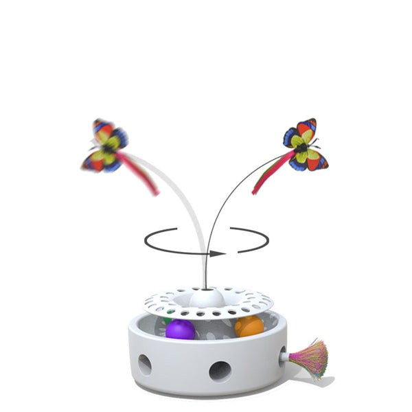 - Two Modes, Triple Play: Mode 1: Butterfly Spin 360 degree full rotation for mesmerizing action. Mode 2: Feather Teaser — retractable.