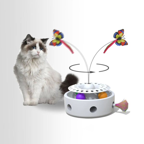 Engage your cat with a 3-in-1 interactive toy featuring a spinning butterfly, retractable feather teaser—perfect for playtime and shedding control.