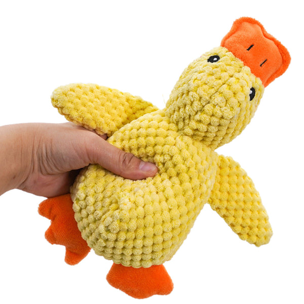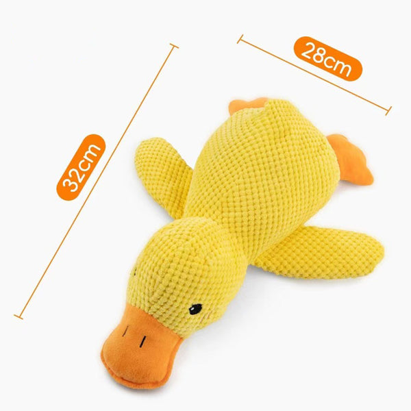 - Keep your dog entertained and focused with a calming duck dog toy a fun and interactive toy that emits a happy quacking sound with every bite.
