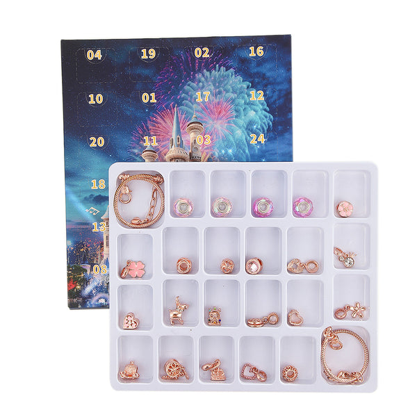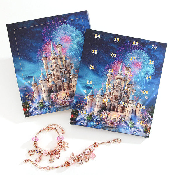 A festive 24-day jewelry blind box featuring a daily surprise of charms and beads to create customizable bracelets, perfect for building holiday excitement.