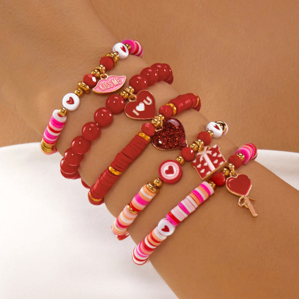 Set of six stylish heart-themed bracelets designed for layering or wearing individually, perfect for expressing love on Valentine’s Day or adding a romantic touch to everyday outfits.