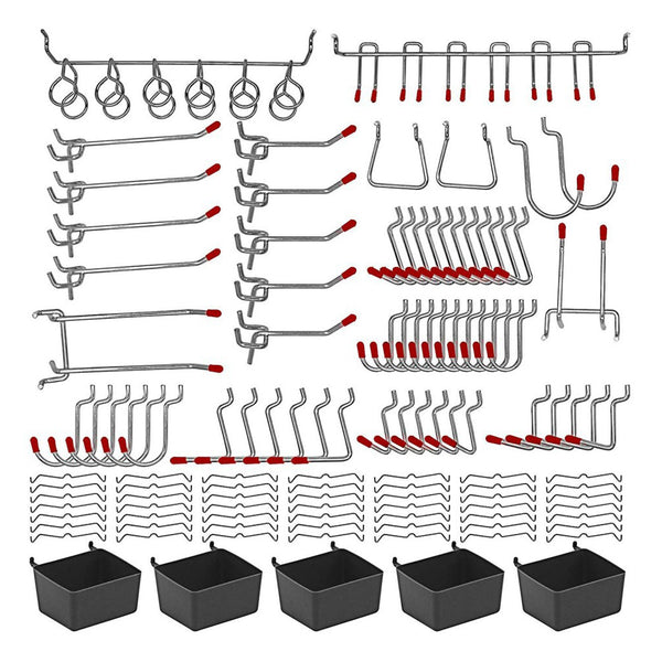 Includes 114 pieces with 16 different types of pegboard accessories: pegboard bins, peg locks, straight hooks, curved hooks, angled hooks, and more