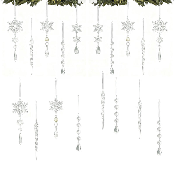 Elegant 18-piece set of shimmering snowflake and icicle-shaped ornaments crafted from high-clarity acrylic to create a dazzling winter wonderland effect.