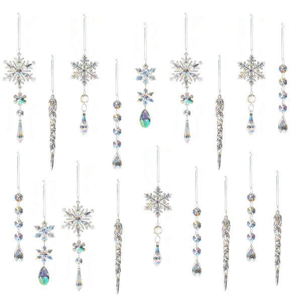 Elegant 18-piece set of shimmering snowflake and icicle-shaped ornaments crafted from high-clarity acrylic to create a dazzling winter wonderland effect.