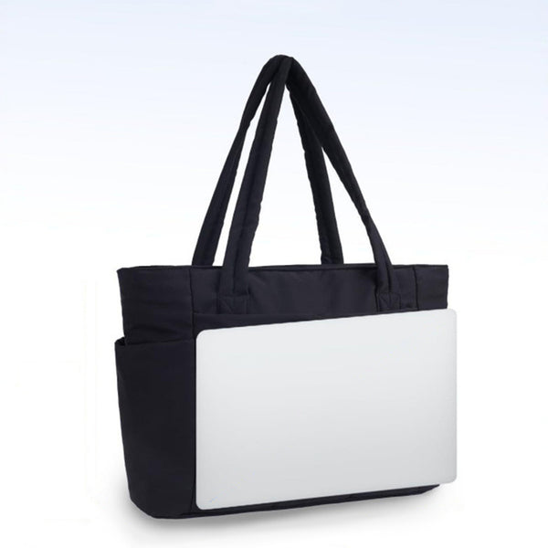 A stylish and functional women’ s tote bag with a built-in cup holder and luggage sleeve, perfect for travel, work, gym, or daily use.